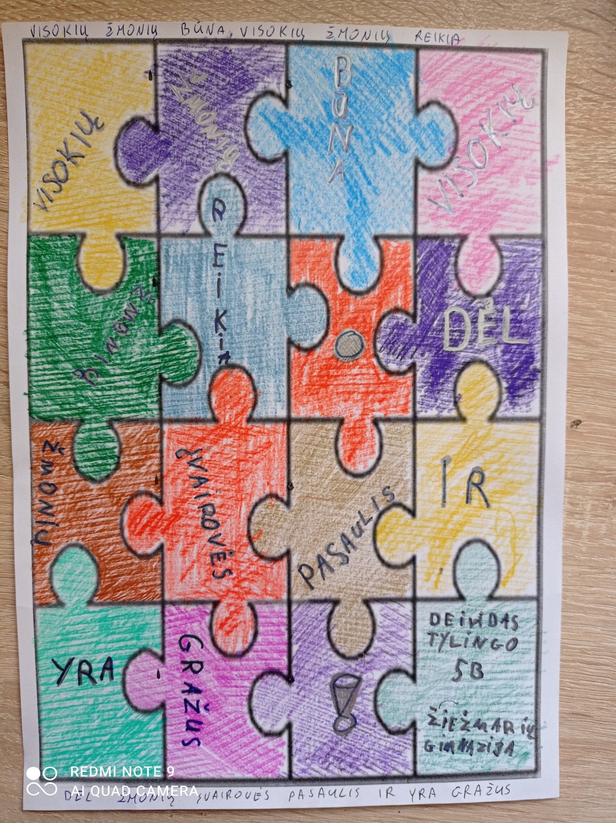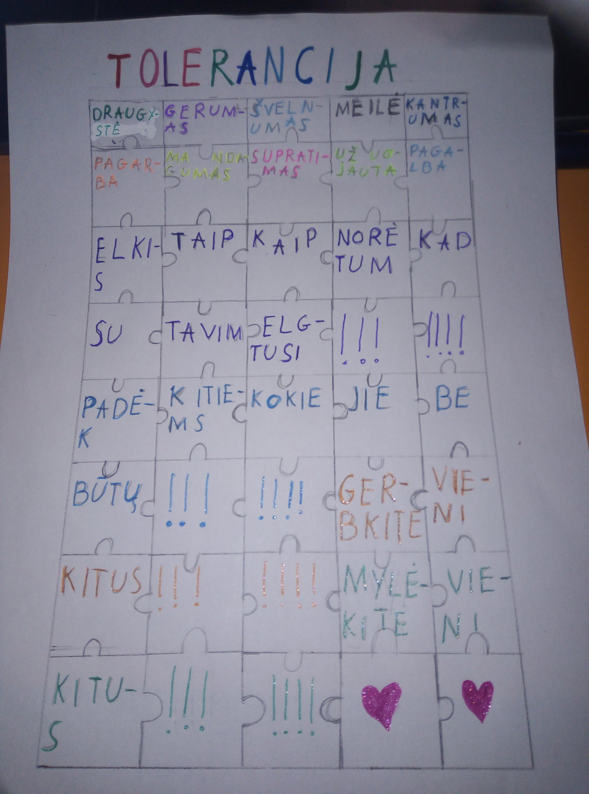 Kad įtvirtintumėme savo suvokimą apie pakantumą, kiekvienas savarankiškai piešėme dėliones. Dėlionė - šių metų Tolerancijos dienos idėja. Mūsų piešiniuose turėjo atsispindėti skirtingos detalės, kurias sudėjus išeina užrašas arba paveikslas.