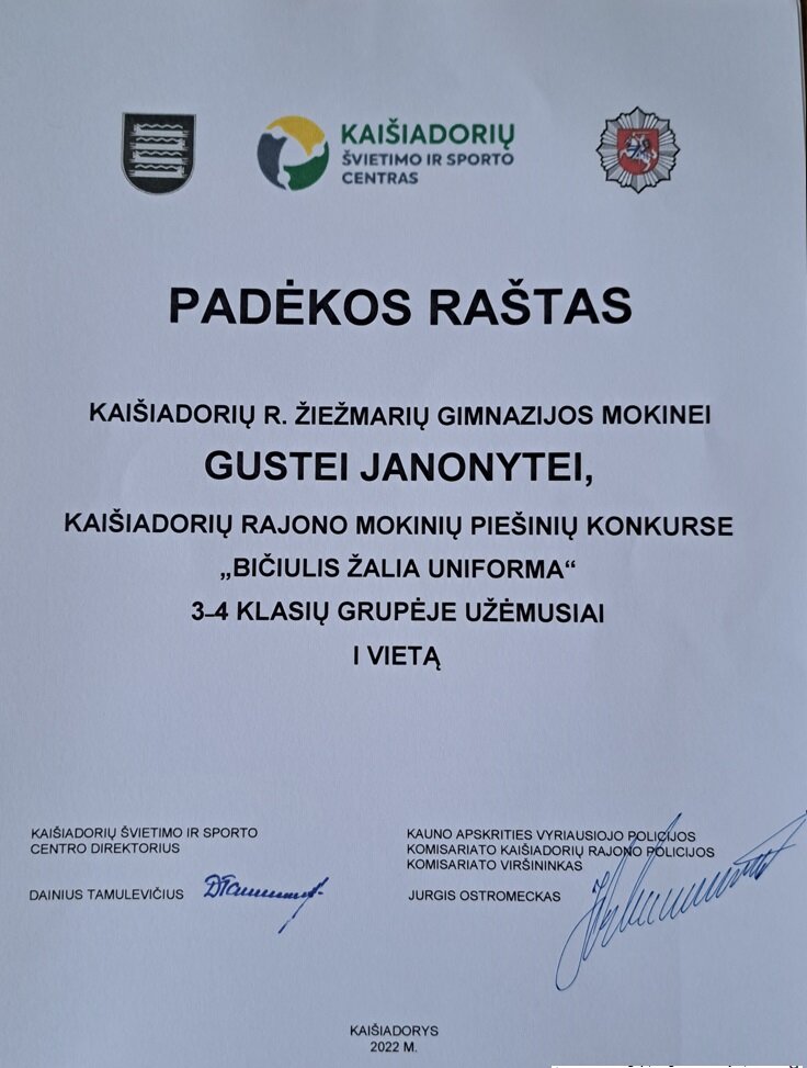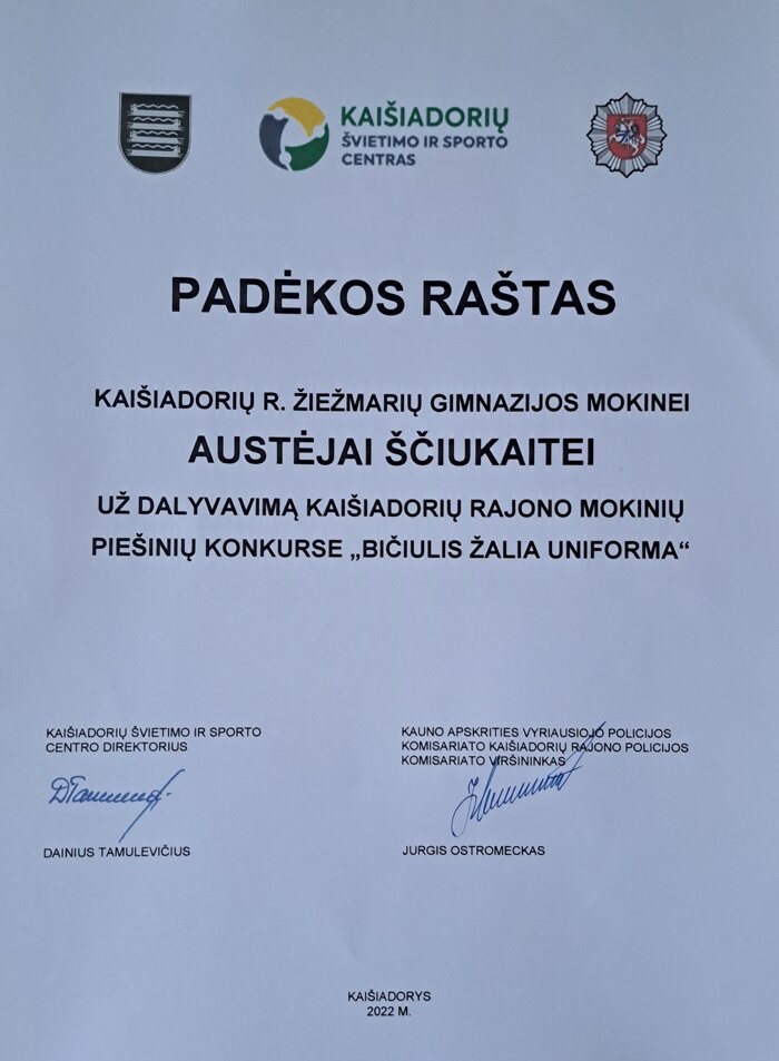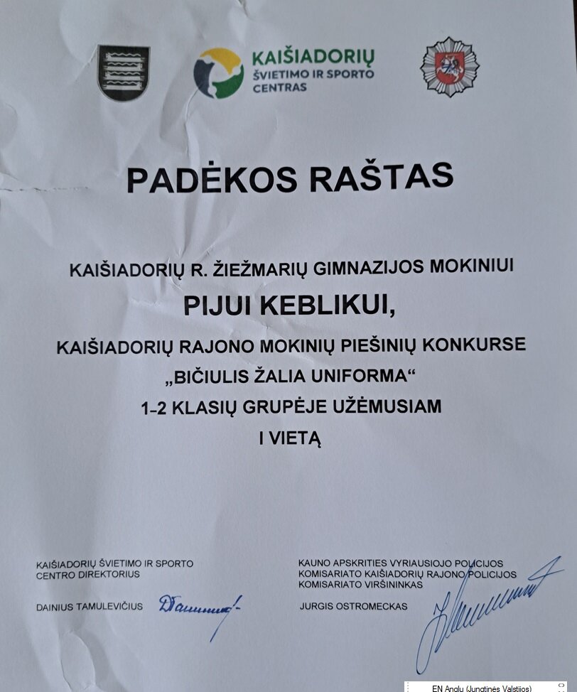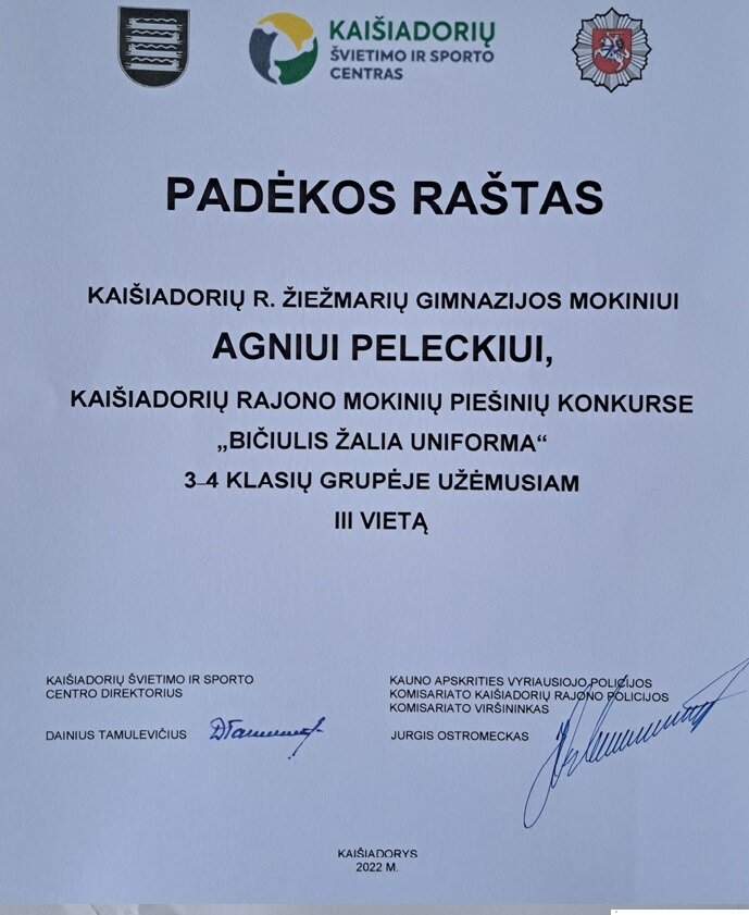 Spalio 4 d. Kaišiadorių švietimo ir sporto centre buvo apdovanoti rajono ikimokyklinio, priešmokyklinio ugdymo ir 1-4 kl. Mokinių piešinių konkurso „Bičiulis žalia uniforma“ nugalėtojai.