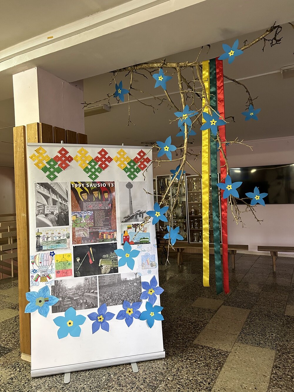 Stendą puošė mūsų mokinių piešiniai, skirti Sausio 13 – tajai ir neužmirštuolės, Laisvės gynėjų atminimo simbolis. Foje, pertraukų metu, mokiniai galėjo stebėti dokumentinę medžiagą apie 1991 metų Sausio 13 - osios įvykius.