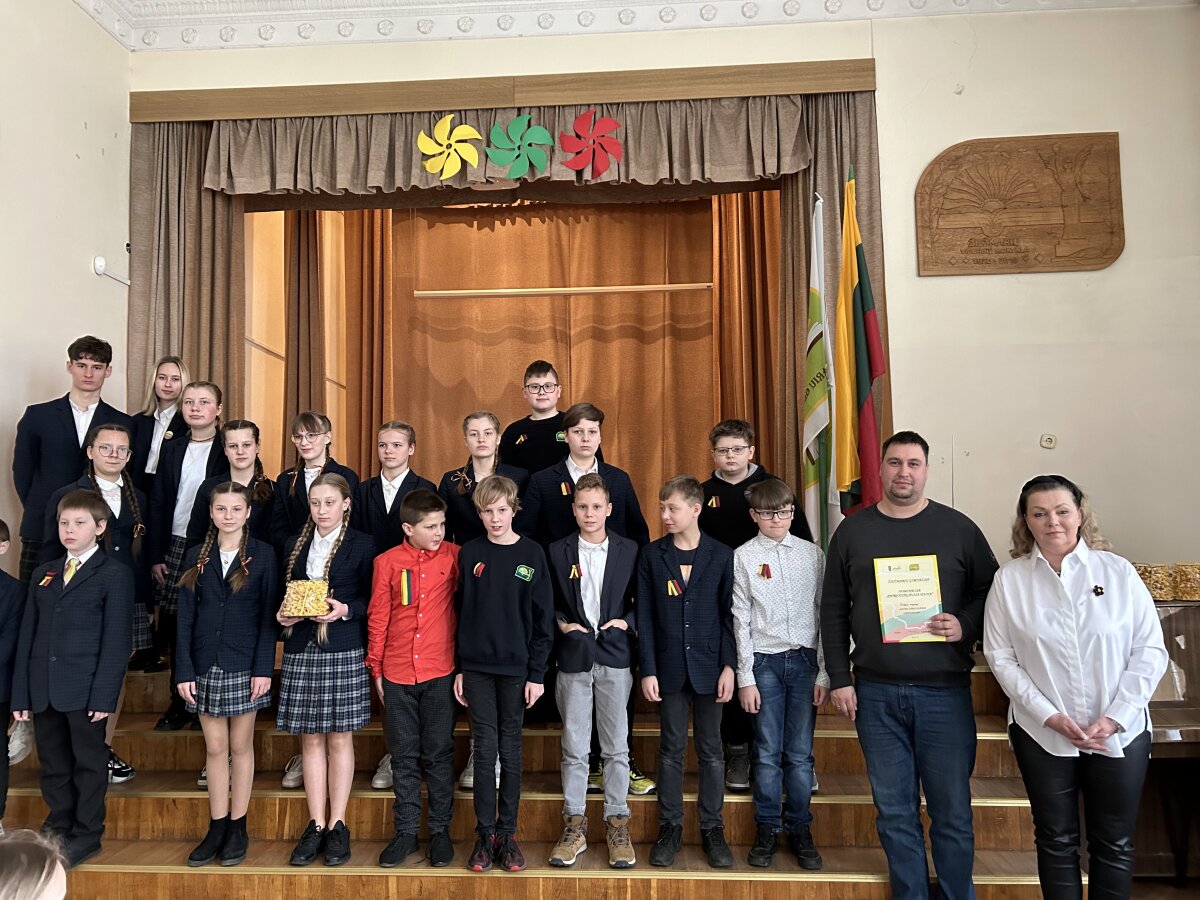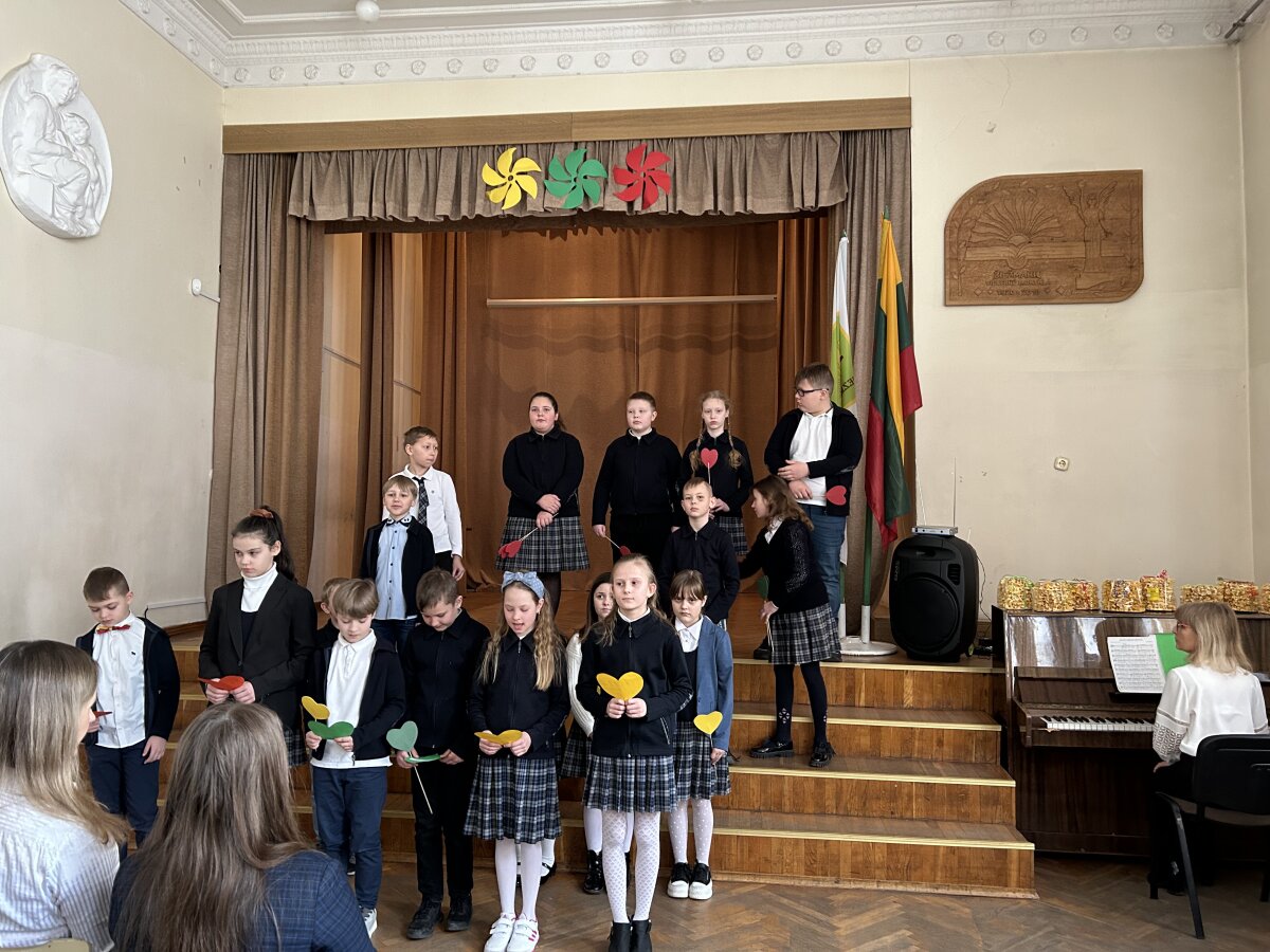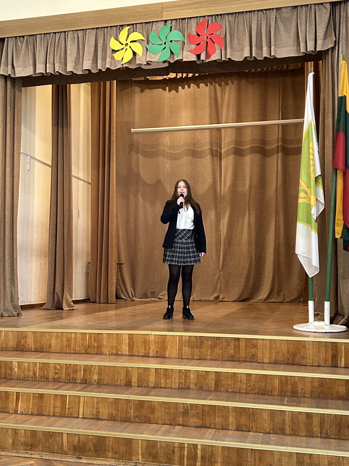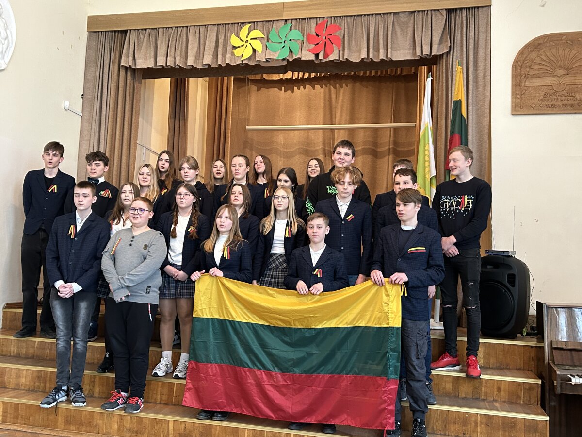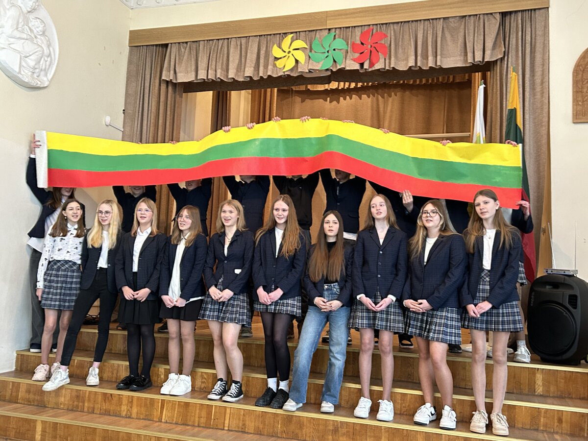 Visus renginio dalyvius su daina sveikino 7b klasės mokinė Gabija Nanartavičiūtė ir jos muzikos mokytoja Renata Balčiūnienė. Gimnazistų renginyje sveikinimą Lietuvai skyrė ir gimnazijos mokytojai, jie atliko Vytauto Kernagio dainą ,Mano gimtinė“. Visą dieną gimnazijoje sklandė, pakili, šventiška nuotaika. Džiaugėmės, kad mokiniai atsakingai pasiruošė, parodė savo gebėjimus dainuodami, šokdami, deklamuodami eiles, patys grodami muzikos instrumentais, pritardami ritmiškais plojimais klasės draugams ar iškeldami Lietuvos trispalvę.